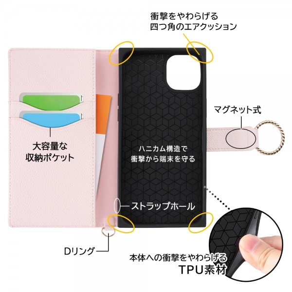 やさしいカラーのシュリンク調PUレザーにゴールドのリングがアクセント。指輪のような落下防止リング。動画視聴などに便利なスタンド機能。ソフトなTPU素材で端末本体を衝撃からしっかり保護。ストラップホール・Dリング付。