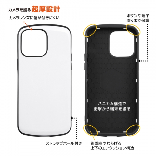 トレンドのカラーやモチーフを取り込んだデザインケース。とにかく強い二重構造。衝撃をやわらげる上下のエアクッション構造。ケース内側のハニカム構造で衝撃から端末を護る。カメラレンズに傷が付きにくい設計。