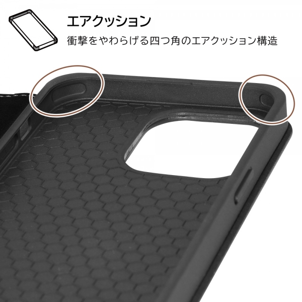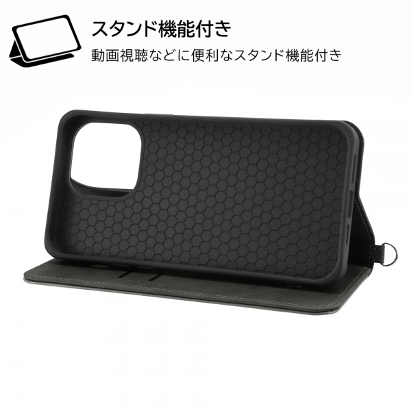 2色のレザーでシンプル過ぎない色合い。カードが入れられる大容量な収納ポケット。マグネット不使用で端末や磁気カードなどの機能を阻害しない。動画視聴などに便利なスタンド機能付。ストラップホール・Dリング付。