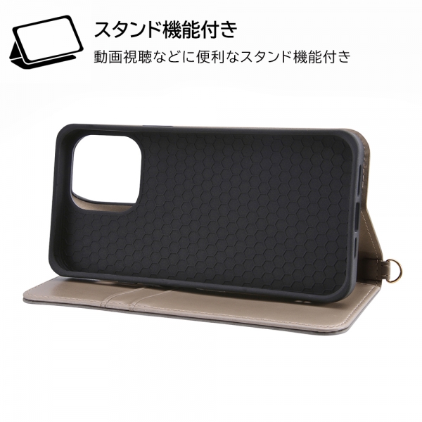柔らかな質感の手帳型ケース。カードが入れられる大容量な収納ポケット。マグネット不使用で端末や磁気カードなどの機能を阻害しない。ストラップホール・Dリング付。動画視聴などに便利なスタンド機能付。