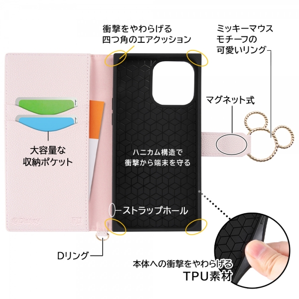 やさしいカラーのシュリンク調PUレザーにミツマルミッキーモチーフのリングがアクセント。リングは指を通して落下防止リングとして使用可能。動画視聴などに便利なスタンド機能。ソフトなTPU素材で端末本体を衝撃からしっかり保護。ストラップホール・Dリング付。
