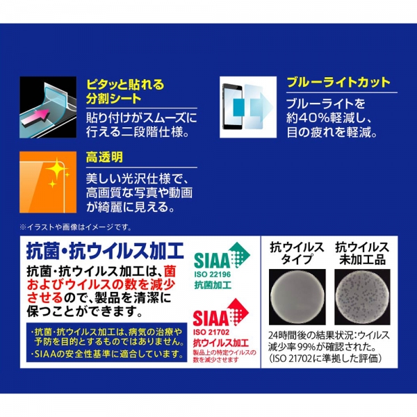目の疲れを軽減/高透明。貼り付けがスムーズに行える二段階仕様。ブルーライトを約40%軽減し、目の疲れを軽減。美しい光沢仕様で、高画質な写真や動画が綺麗に見える。ウイルスの数を減少させ、製品を清潔に保つことができます。SIAAの安全性基準に適合。