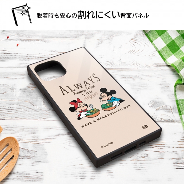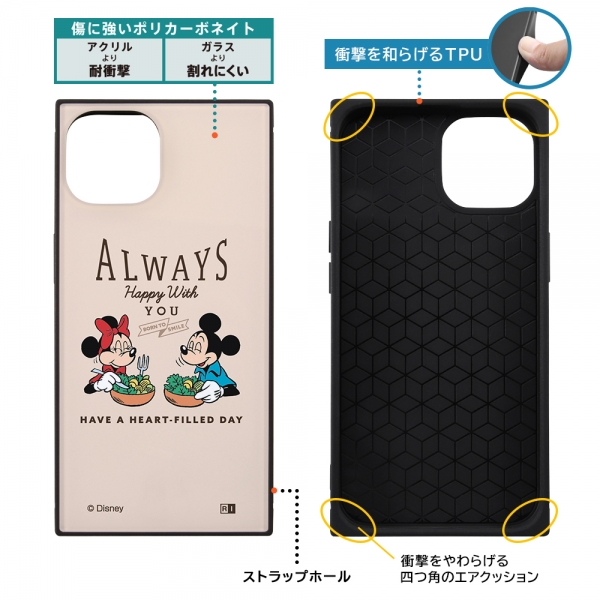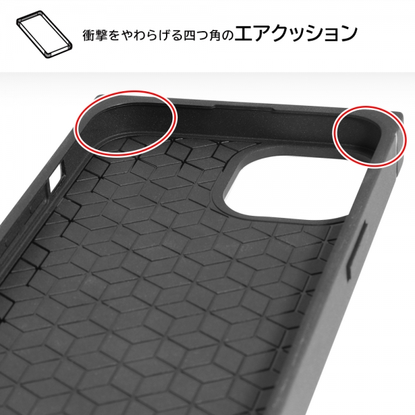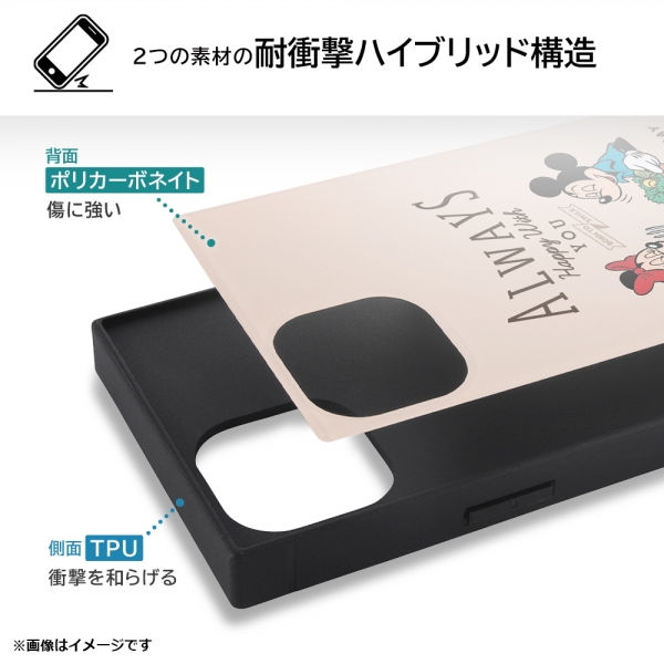 個性的な四角いフォルムと、衝撃に強いTPU素材の側面、薄くて軽く透明度の高いPCパネル を背面にセットした iPhone 14 / 13 用 耐衝撃ケース KAKUハイブリッド。端末側面保護、衝撃吸収エアクッション付。背面パネルには『ディズニーキャラクター』のデザインがプリントされ、スマートフォンを鮮やかに彩ります。