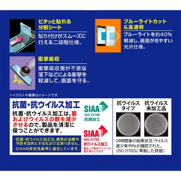衝撃吸収 ブルーライトカット 高光沢 抗菌・抗ウイルス 指紋認証対応
