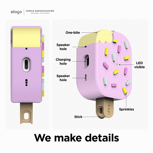 「かわいいアイスクリーム型」アイスクリームをモチーフにした、おしゃれでかわいいデザインケースです。「カラビナ付き」落下や紛失の軽減や、簡単に持ち運びできる、カラビナを付属しております。「落下衝撃を軽減」耐久性の高い厚みのあるシリコンを採用し、衝撃やスクラッチから本体をしっかり保護します。「高品質シリコン」高品質なシリコン素材を採用し、シンプルながらも高級感のある仕上がりになっています。「ケースを付けたまま充電可能」ケースを付けたまま、ワイヤレス充電やケーブル接続での充電が可能です。
