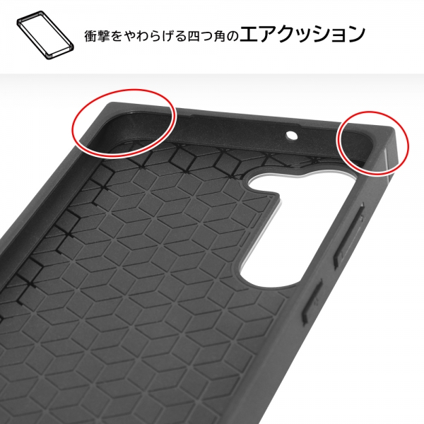 背面は傷に強いポリカーボネイト。側面は衝撃を和らげるTPU素材。四つ角エアクッション付。ストラップホール付。