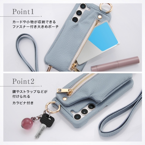 カードやリップなどが入る便利なポーチ付き!ポーチはスタンドとしても使用可能。ショルダーストラップは長さ調整が可能。