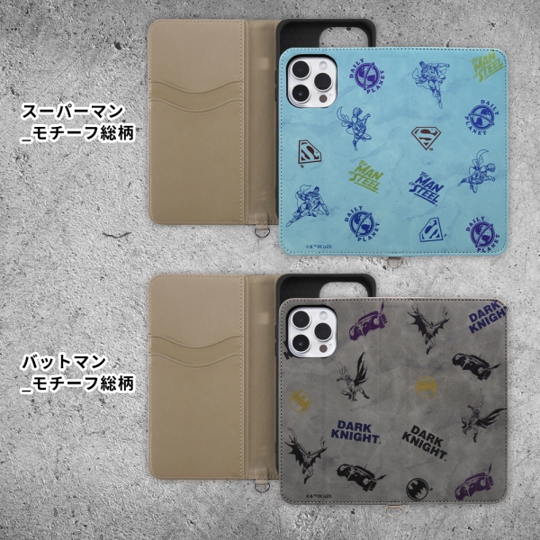 表情のあるむら染めPUレザーとトープ色のPUレザーを組み合わせた、『スーパーマン』のデザインがプリントされた手帳型iPhone 14 Pro Max 用ケース。