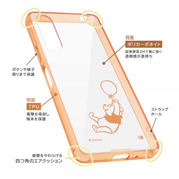 カメラレンズに傷が付きにくい。背面は傷に強い素材【鉛筆硬度2H】。衝撃をやわらげる四つ角のエアクッション構造 。ボタンや端子周りまで保護。