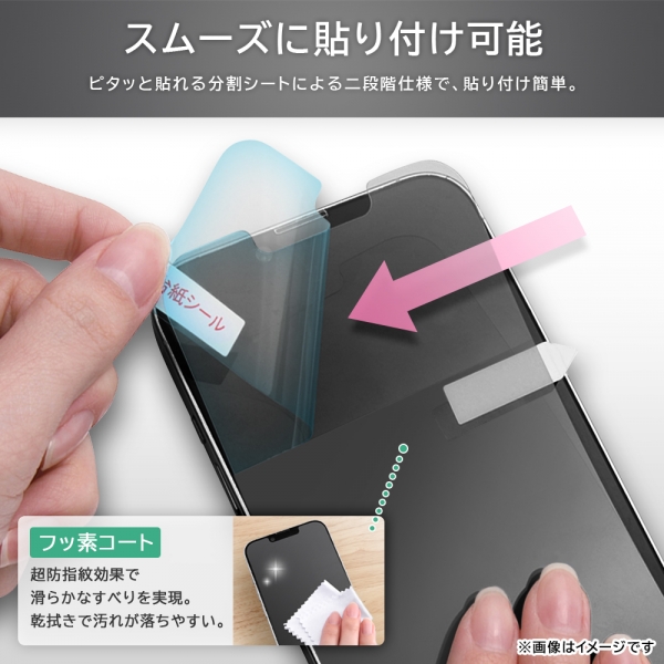 貼り付けがスムーズに行える二段階仕様。超防指紋効果で、汚れの落ちやすさと滑らかな指すべりを実現。薄型なので段差を感じにくい。タッチ感も良いので操作性抜群。美しい光沢仕様で、高画質な写真や動画が綺麗に見える。