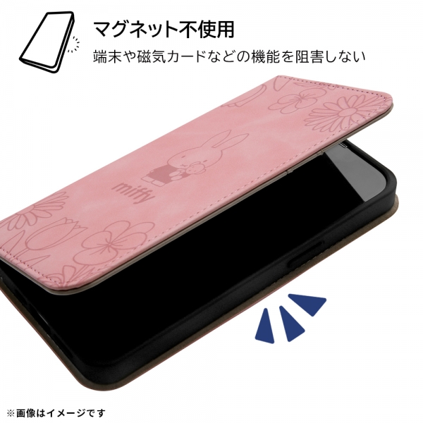 表情のあるむら染めPUレザーとトープ色のPUレザーを組み合わせた、『ミッフィー ( miffy )』のデザインがプリントされた手帳型iPhone 14 / 13 用ケース。