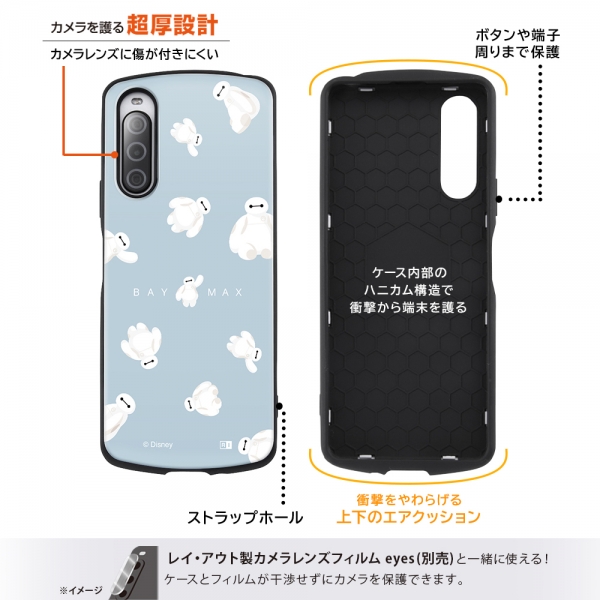 側面は柔らかくしなやかに、背面は傷がつきにくい。ハニカム×エアクッション構造で端末を衝撃から守る。カメラレンズに傷がつきにくい。ストラップホール付。