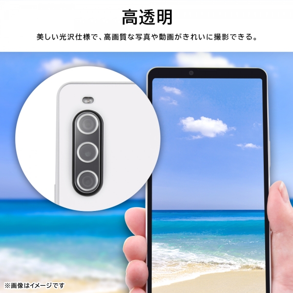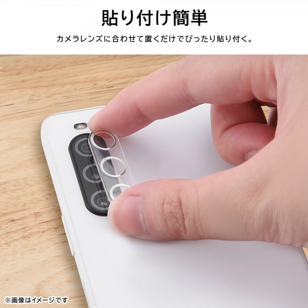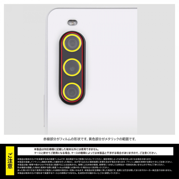 カメラのフチを彩るメタリック加工。レンズ部分の透過率約92%、高画質な写真や動画が撮影できる。汚れをはじくコーティングで清潔な状態を保つ。誰でも簡単に装着でき、位置ズレの心配なし。