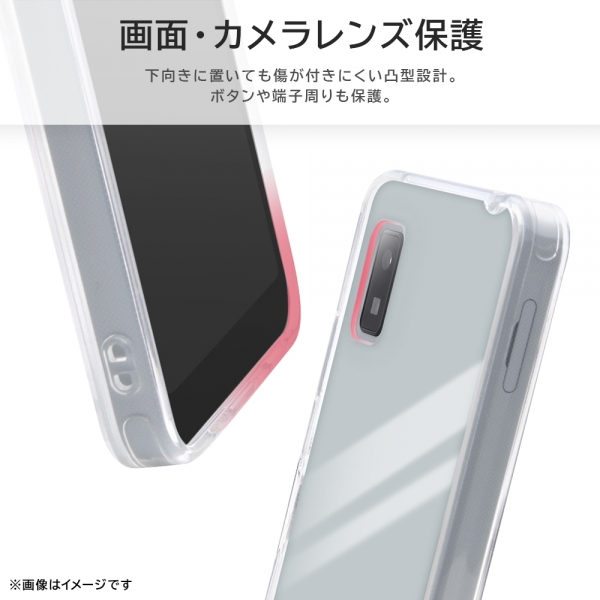 カメラレンズに傷が付きにくい。背面は傷に強い素材【鉛筆硬度2H】。衝撃をやわらげる四つ角のエアクッション構造 。ボタンや端子周りまで保護。