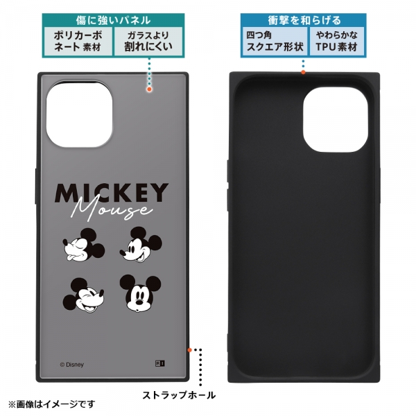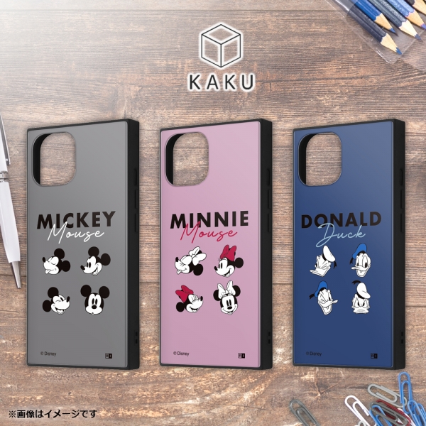 個性的な四角いフォルムと、衝撃に強いTPU素材の側面、薄くて軽く透明度の高いPCパネル を背面にセットした iPhone 2023 6.1inch 2眼モデル / 14 / 13 用 KAKUハイブリッド。端末側面保護、衝撃吸収エアクッション付き。背面パネルには『ディズニーキャラクター』のデザインがプリントされ、スマートフォンを鮮やかに彩ります。