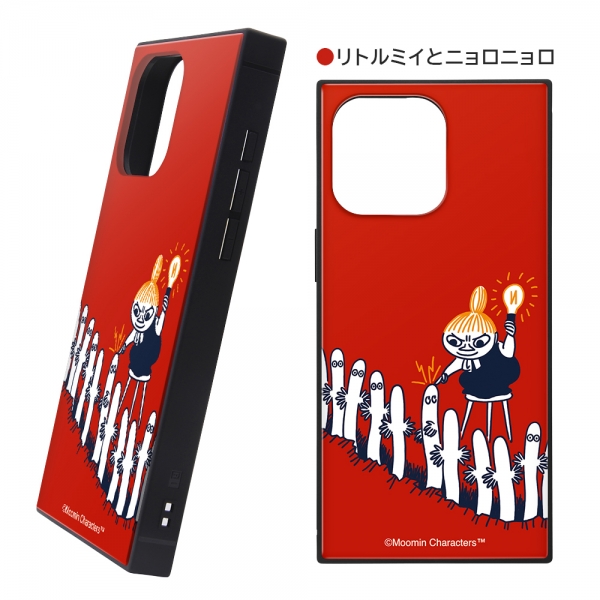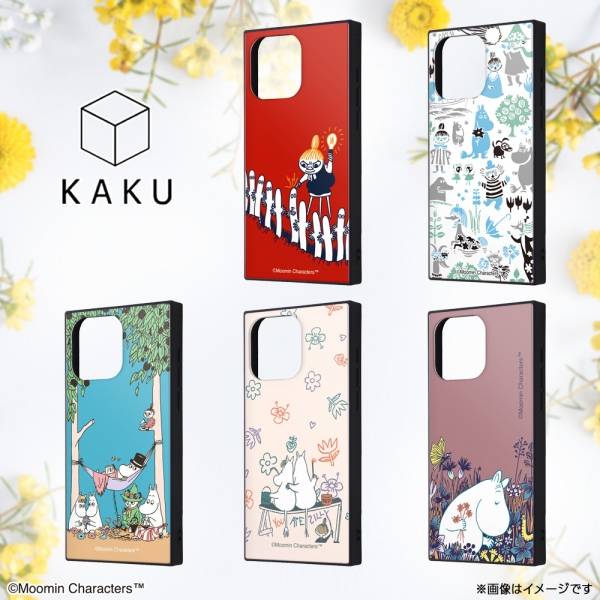 個性的な四角いフォルムと、衝撃に強いTPU素材の側面、薄くて軽く透明度の高いPCパネル を背面にセットした iPhone 2023 6.7inch 3眼モデル 用 KAKUハイブリッド。端末側面保護、衝撃吸収エアクッション付き。背面パネルには『ムーミン』のデザインがプリントされ、スマートフォンを鮮やかに彩ります。