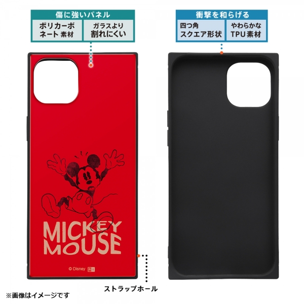 個性的な四角いフォルムと、衝撃に強いTPU素材の側面、薄くて軽く透明度の高いPCパネル を背面にセットした iPhone 15 Plus 用 KAKUハイブリッド。端末側面保護、衝撃吸収エアクッション付き。背面パネルには『ディズニーキャラクター』のデザインがプリントされ、スマートフォンを鮮やかに彩ります。