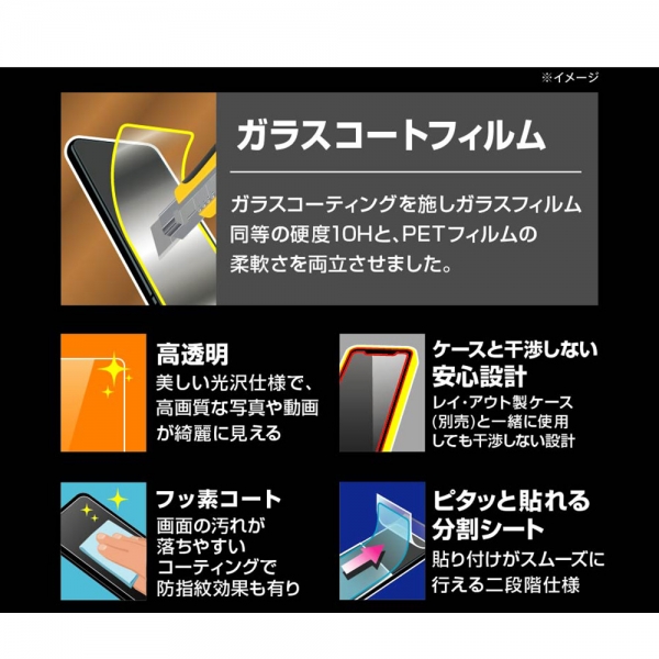 ガラスコーティングを施し、ガラスフィルムと同等の硬度10Hと、貼り直しの際に割れる心配のないPETフィルムの柔軟さを両立。フィルムを厚くすることで、不意な衝撃から画面を保護。超防指紋効果で、滑らかな指すべりを実現。乾拭きで画面の汚れが落ちやすい。美しい光沢仕様で、高画質な写真や動画が綺麗に見える。