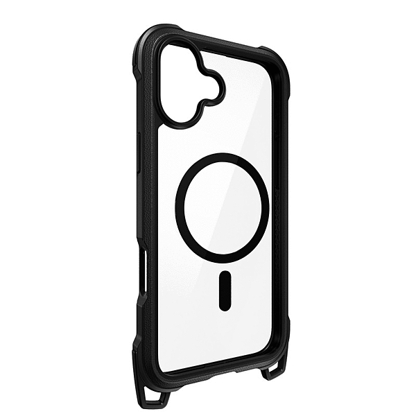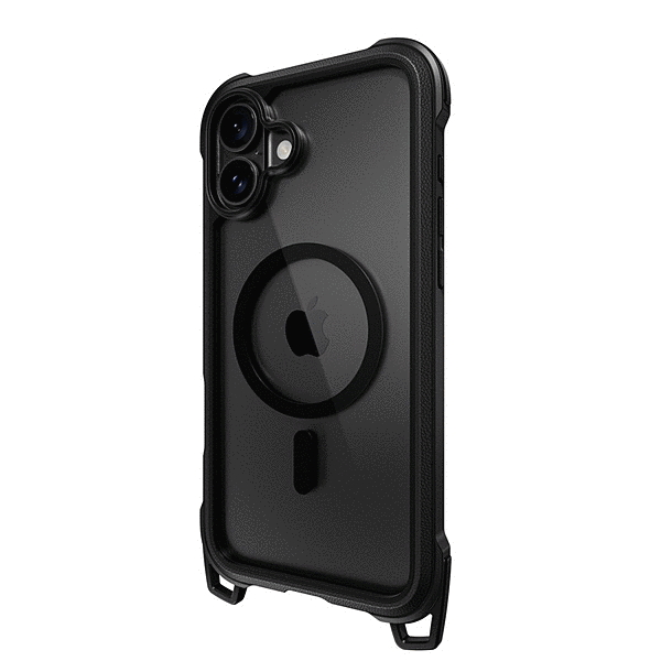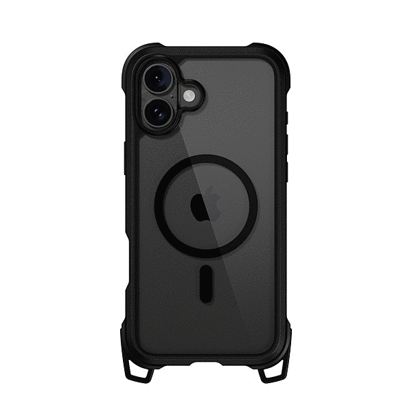 「クロスボディフォンケース」長さ調整可能なストラップには、カラビナやキーリングなどを装着できるループが付いています。「マグネット搭載」Apple純正MagSafe充電器を含む対応アクセサリが付けられ、MagSafe規格に準じたワイヤレス充電が可能です。「MIL規格準拠」米国防総省制定の、MIL-STD-810規格準拠の試験をクリアした衝撃に強い設計です。「透明度の高いバックパネル」ケース背面に透明度の高いポリカーボネートを使用しているので、デバイスのデザインを活かすことができます。「コーナーパーツ付け替え可能」ストラップを取り付けるコーナーパーツは付け外しができ、ストラップホールの無いすっきりしたケースとしても使用可能です。