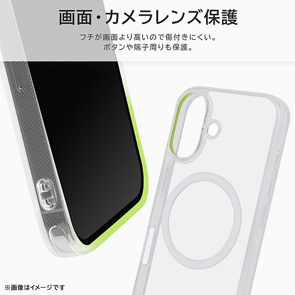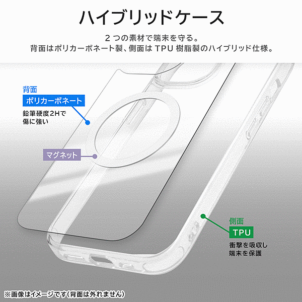 MagSafeなどの充電器やアクセサリーに対応。背面は傷に強い素材【表面硬度2H】。衝撃をやわらげるエアクッション構造。フチが画面やカメラより高いので傷付きにくい。ストラップホール付き。