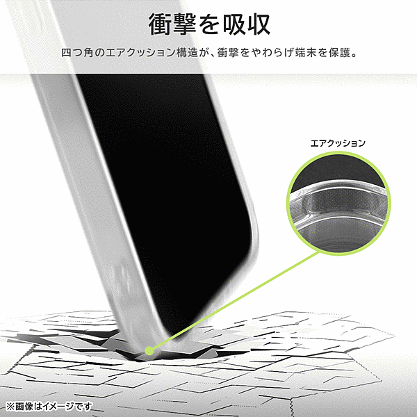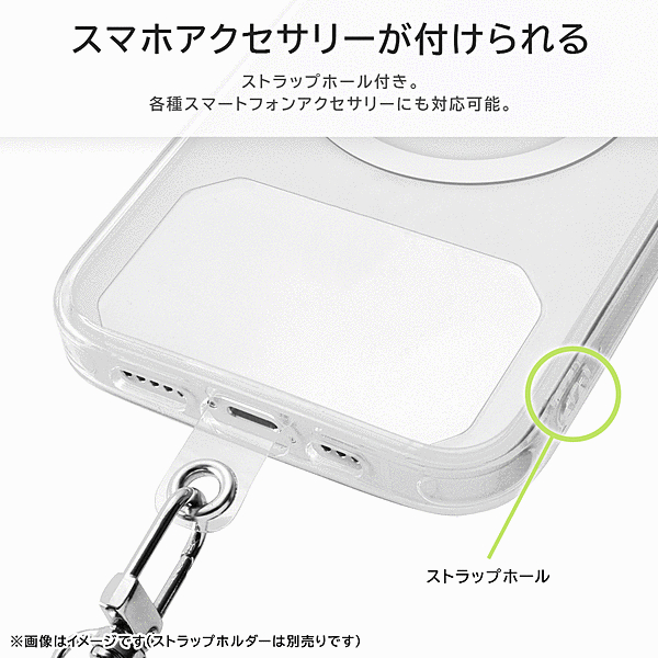 MagSafeなどの充電器やアクセサリーに対応。背面は傷に強い素材【表面硬度2H】。衝撃をやわらげるエアクッション構造。フチが画面やカメラより高いので傷付きにくい。ストラップホール付き。