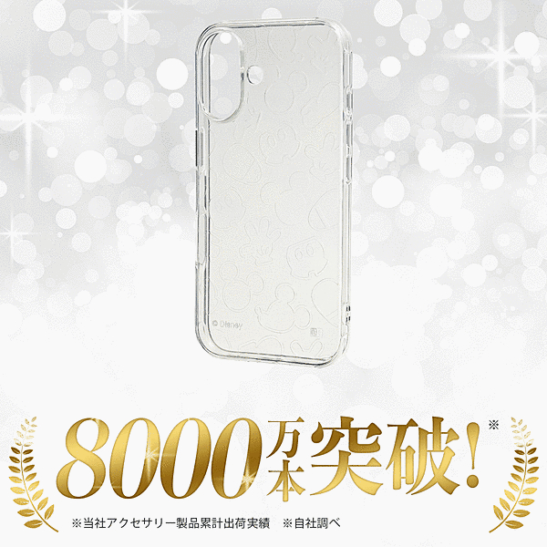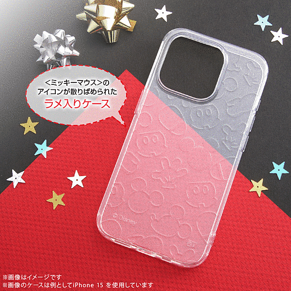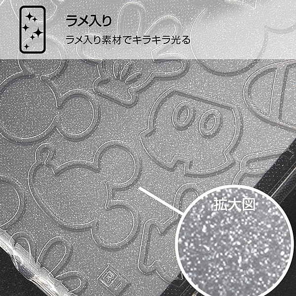 ミッキーマウスのアイコンが散りばめられた可愛いラメ入りケース