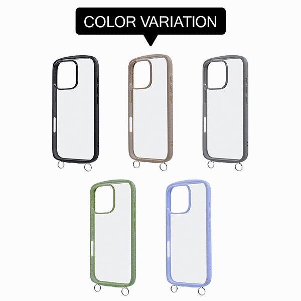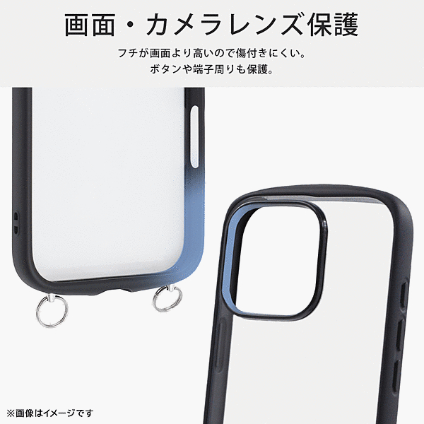 傷に強く黄ばみにくい。衝撃をやわらげる全周囲クッション構造。高い透明感、クリア長持ち。ストラップが付けられる金具付き。