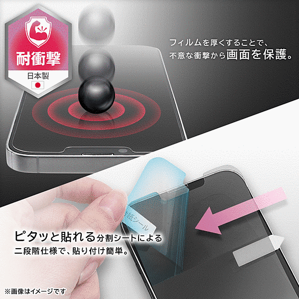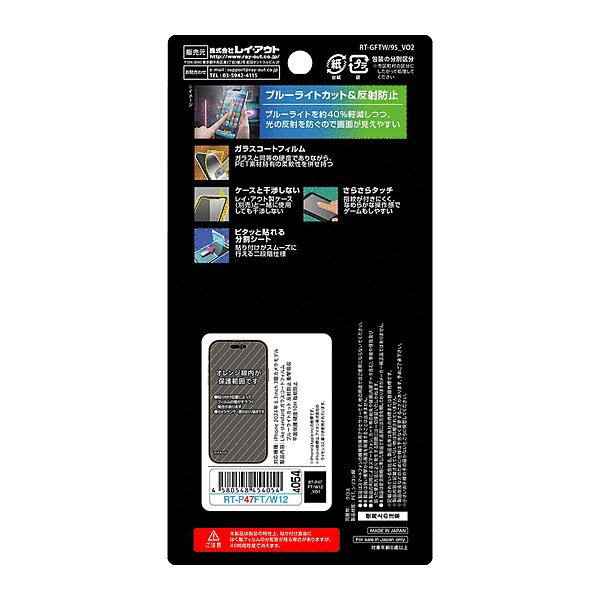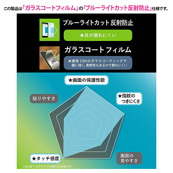 ガラスと同等の硬度でありながら、PET素材特有の柔軟性を併せ持つガラスコートフィルム。フィルムを厚くすることで、不意な衝撃から画面を保護。超防指紋効果で、滑らかな指すべりを実現。乾拭きで画面の汚れが落ちやすい。ブルーライトを約40%軽減し、目の疲れを軽減。太陽光や照明の反射を防ぐので画面が見やすい。