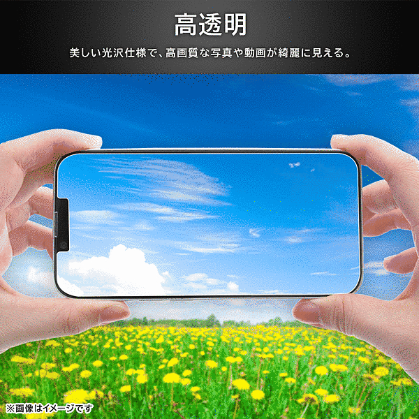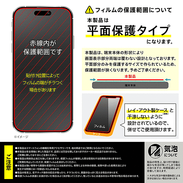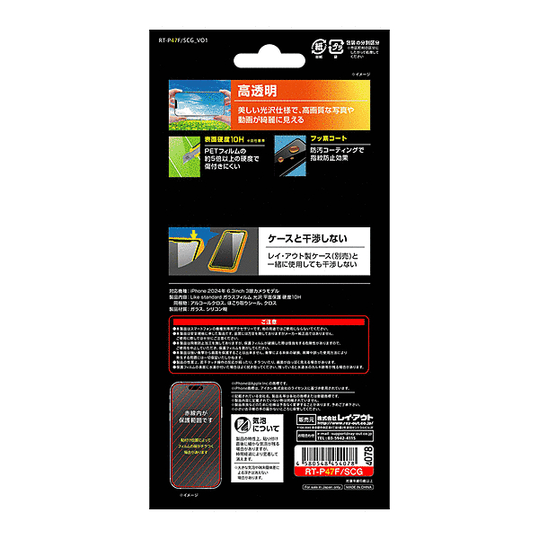 PETフィルムの約5倍の硬度で傷付きにくい。美しい光沢仕様で、高画質な写真や動画が綺麗に見える。防汚コーティングで指紋防止効果。レイ・アウト製ケース(別売)と一緒に使用しても干渉しない設計。