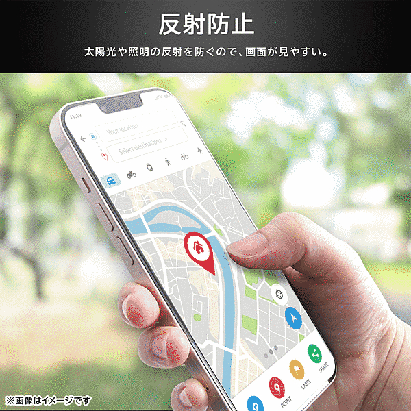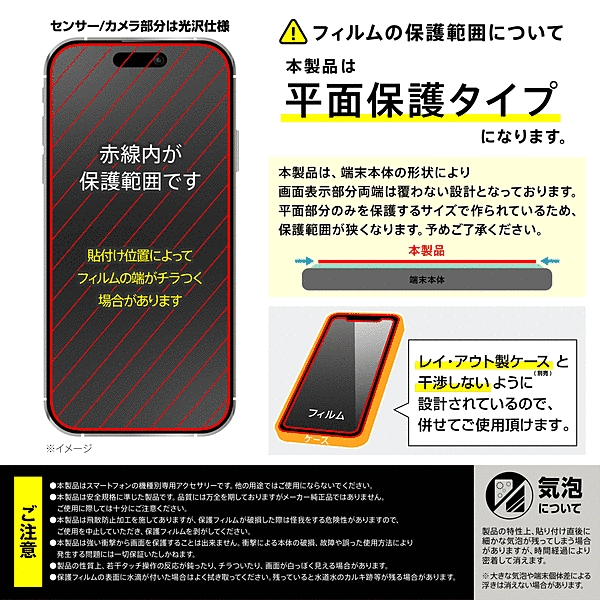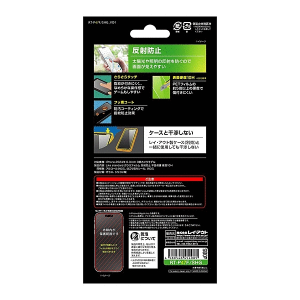 PETフィルムの約5倍の硬度で傷付きにくい。太陽光や照明の反射を防ぐので画面が見やすい。防汚コーティングで指紋防止効果。レイ・アウト製ケース(別売)と一緒に使用しても干渉しない設計。