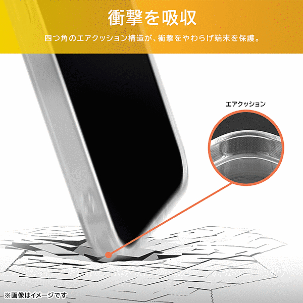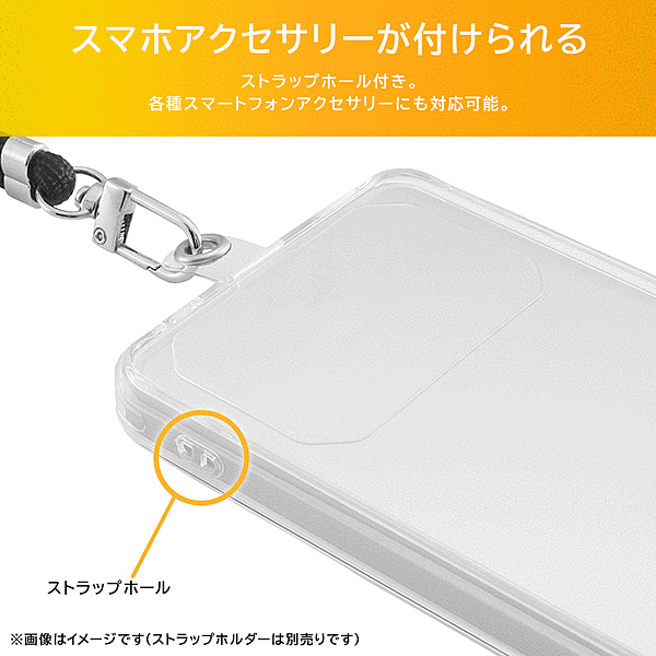 フチが高く画面やカメラが傷つきにくい。高い透明感、クリア長持ち。衝撃をやわらげるエアクッション構造。ボタンや端子周りまで精密に保護。ストラップホール付き。