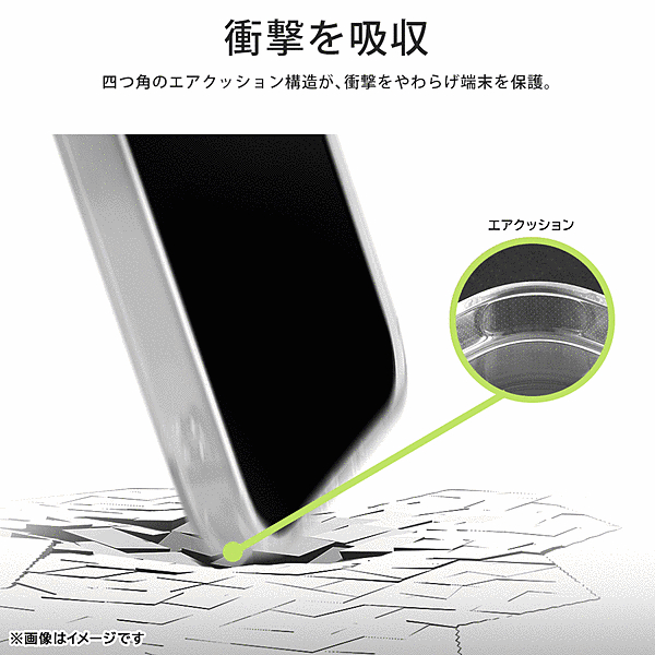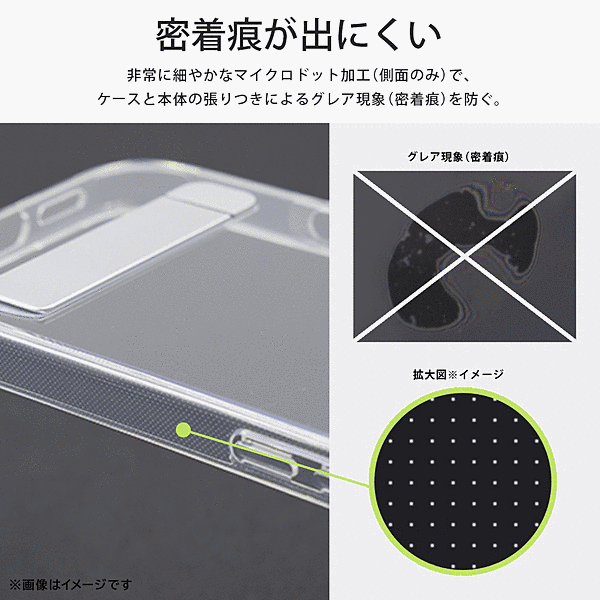薄くて頑丈なスタンド一体型ケース。背面は傷に強い素材【表面硬度2H】。衝撃をやわらげるエアクッション構造。密着痕が出にくいマイクロドット加工。ストラップホール付き。