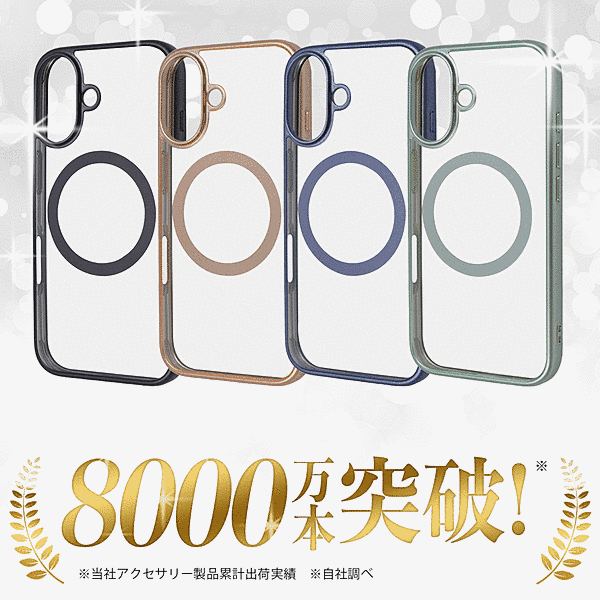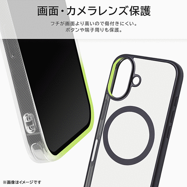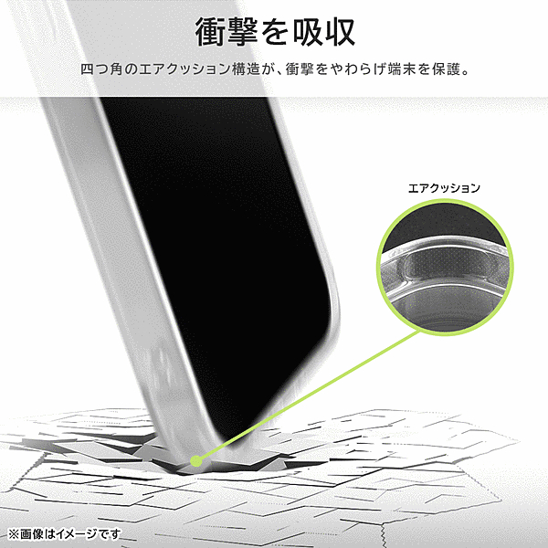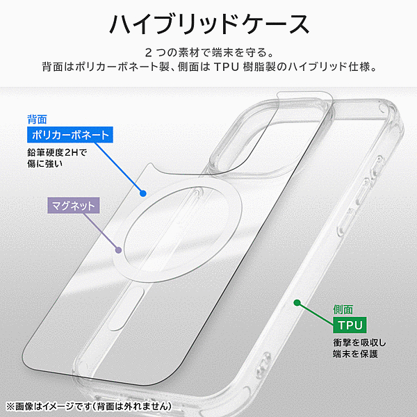 MagSafeなどの充電器やアクセサリーに対応。背面は傷に強い素材【表面硬度2H】。衝撃をやわらげるエアクッション構造。フチが画面やカメラより高いので傷付きにくい。ストラップホール付き。