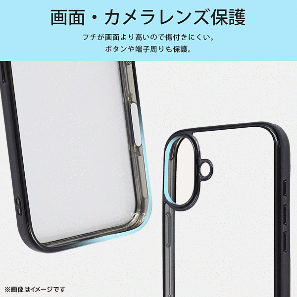 フチが高く画面やカメラが傷つきにくい。背面は傷に強い素材【表面硬度2H】。ボタンや端子周りまで精密に保護。衝撃をやわらげるエアクッション構造。ストラップホール付き。