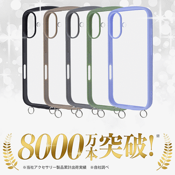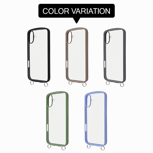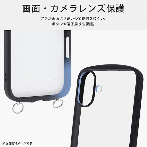 傷に強く黄ばみにくい。衝撃をやわらげる全周囲クッション構造。高い透明感、クリア長持ち。ストラップが付けられる金具付き。