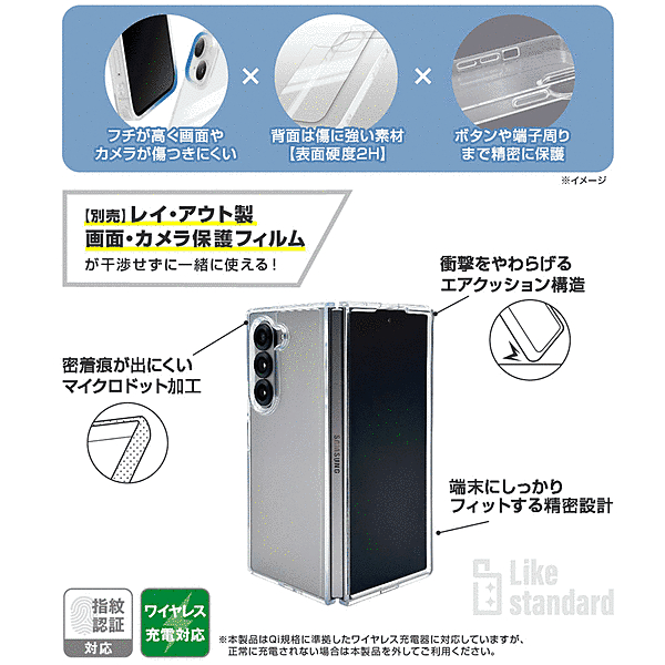 フチが高く画面やカメラが傷つきにくい。背面は傷に強い素材【鉛筆硬度2H】。ボタンや端子周りまで精密に保護。衝撃をやわらげるエアクッション構造 。