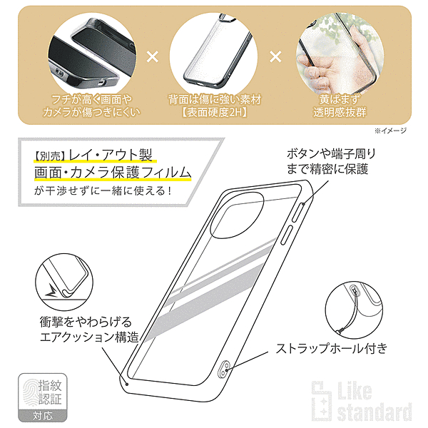 フチが高く画面やカメラが傷つきにくい。背面は傷に強い素材【表面硬度2H】。ボタンや端子周りまで精密に保護。衝撃をやわらげるエアクッション構造。ストラップホール付き。