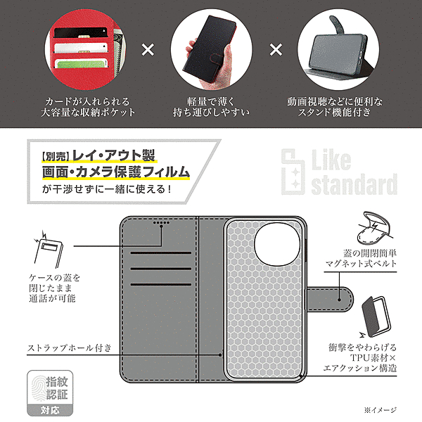 カードが入れられる大容量な収納ポケット。軽量で薄く持ち運びしやすい。動画視聴などに便利なスタンド機能付き。便利な機能を豊富にそなえた手帳型ケースの決定版。ストラップホール付き。