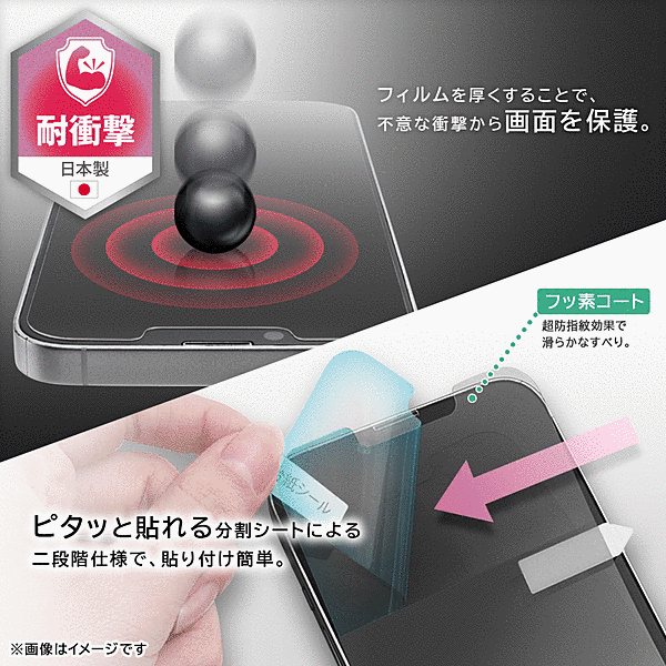 ガラスと同等の硬度でありながら、PET素材特有の柔軟性を併せ持つガラスコートフィルム。フィルムを厚くすることで、不意な衝撃から画面を保護。超防指紋効果で、滑らかな指すべりを実現。乾拭きで画面の汚れが落ちやすい。ブルーライトを約40%軽減し、目の疲れを軽減。美しい光沢仕様で、高画質な写真や動画が綺麗に見える。