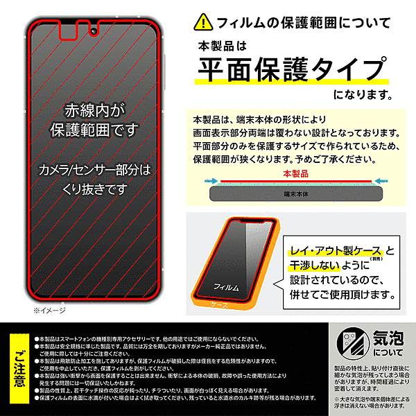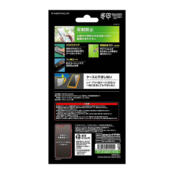 PETフィルムの約5倍の硬度で傷付きにくい。太陽光や照明の反射を防ぐので画面が見やすい。防汚コーティングで指紋防止効果。レイ・アウト製ケース(別売)と一緒に使用しても干渉しない設計。