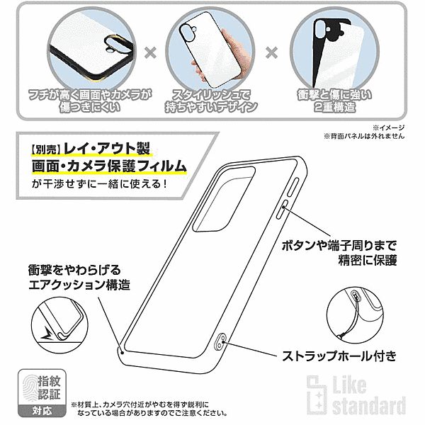 フチが高く画面やカメラが傷つきにくい。指紋が目立ちにくく質感の良いマットカラー。スタイリッシュで持ちやすいデザイン。衝撃と傷に強い2重構造。