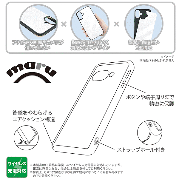 フチが高く画面やカメラが傷つきにくい。指紋が目立ちにくく質感の良いデザイン。衝撃と傷に強い2重構造。衝撃をやわらげるエアクッション構造。