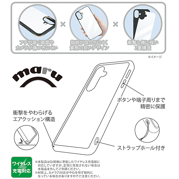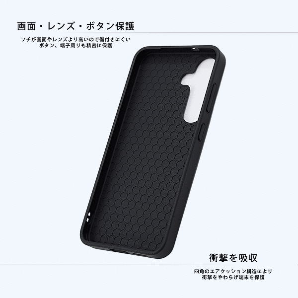 フチが高く画面やカメラが傷つきにくい。指紋が目立ちにくく質感の良いデザイン。衝撃と傷に強い2重構造。衝撃をやわらげるエアクッション構造。