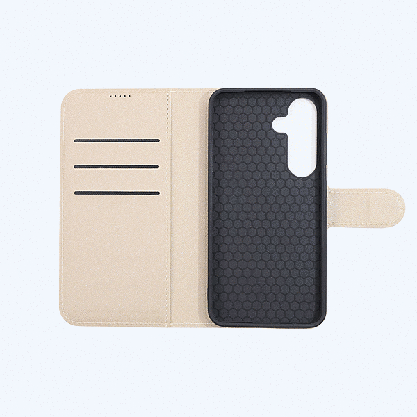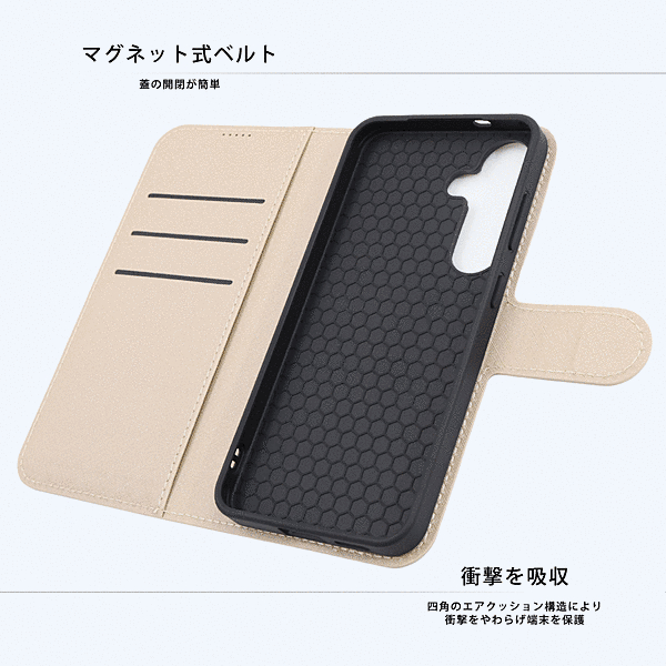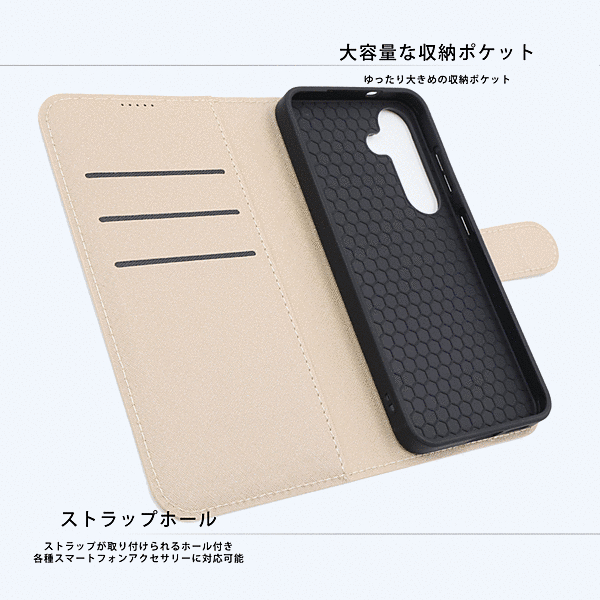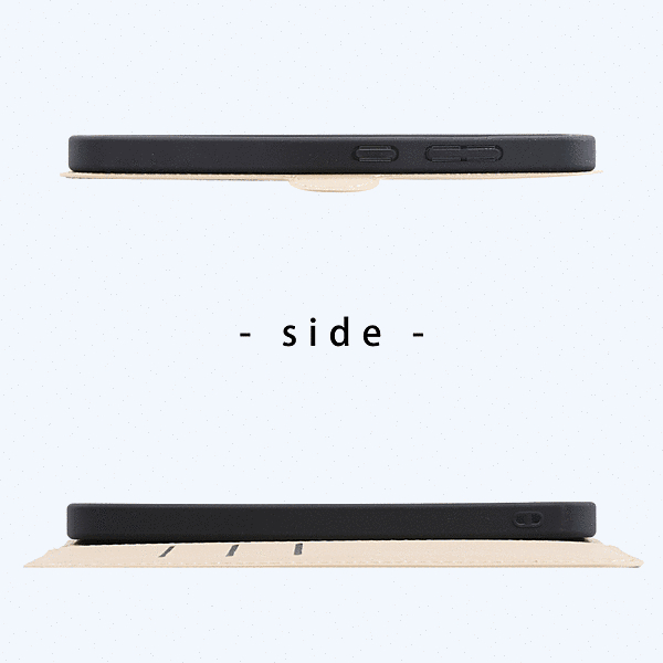 カードが入れられる大容量な収納ポケット。軽量で薄く持ち運びしやすい。動画視聴などに便利なスタンド機能付き。ケースの蓋を閉じたまま通話が可能。