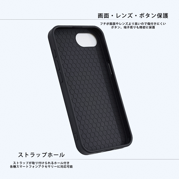 フチが高く画面やカメラが傷つきにくい。指紋が目立ちにくく質感の良いデザイン。衝撃と傷に強い2重構造。衝撃をやわらげるエアクッション構造。