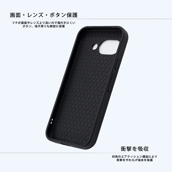 フチが高く画面やカメラが傷つきにくい。指紋が目立ちにくく質感の良いデザイン。衝撃と傷に強い2重構造。衝撃をやわらげるエアクッション構造。