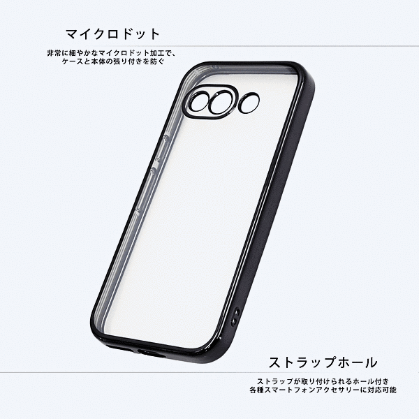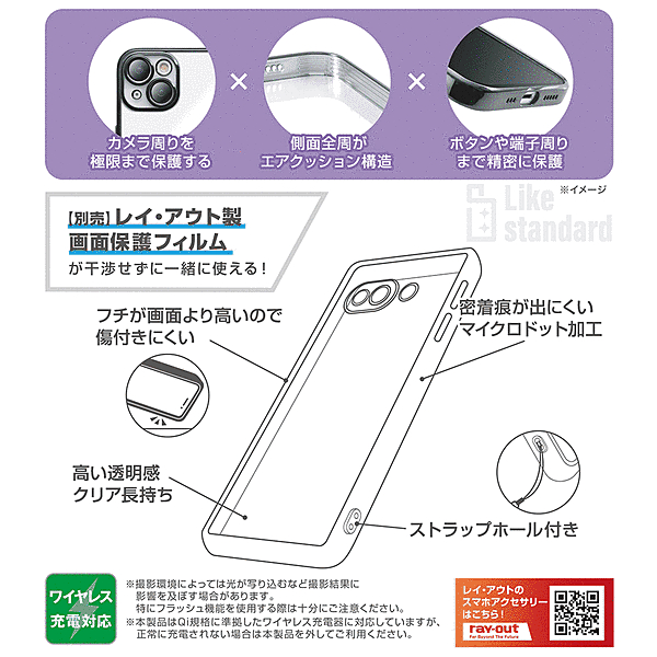 カメラ周りを極限まで保護する精密設計。ボタンや端子周りまで精密に保護。高い透明感、クリア長持ち。密着痕が出にくいマイクロドット加工。ストラップホール付き。