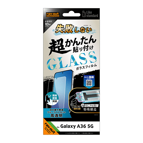 誰でも簡単に貼り付けができる貼り付けキット付きで失敗しない。PETフィルムの約5倍の硬度で傷付きにくい。ブルーライトを約40%軽減、画面が綺麗に見える。防汚コーティングで指紋防止効果。レイ・アウト製ケース(別売)と一緒に使用しても干渉しない設計。