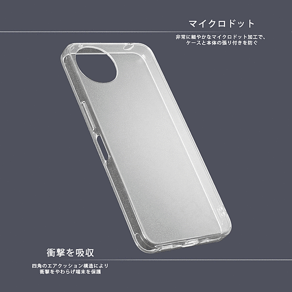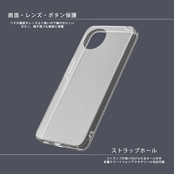 背面は鉛筆硬度2Hで傷が付きにくい。衝撃をやわらげるエアクッション構造。ボタンや端子周りまで精密に保護。ストラップホール付き。