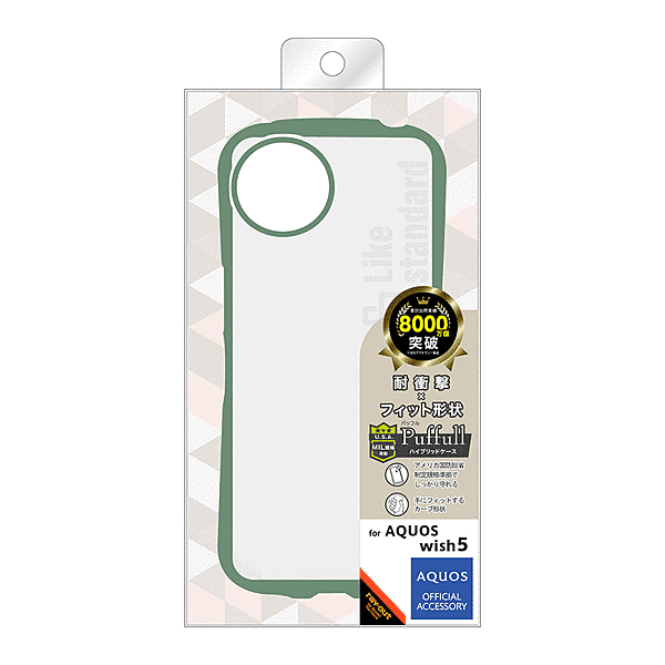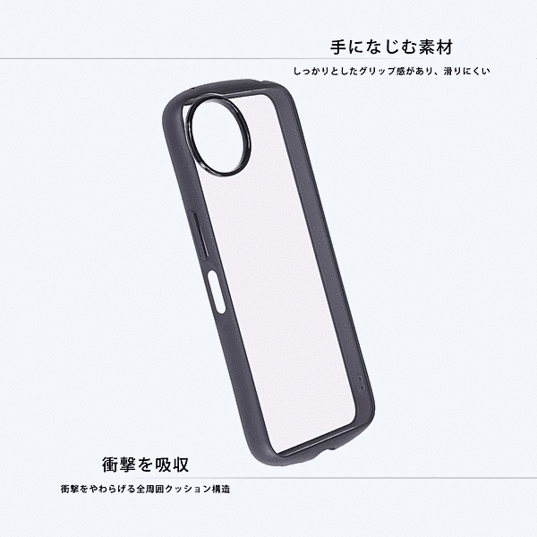 傷に強く黄ばみにくい。衝撃をやわらげる全周囲クッション構造。高い透明感、クリア長持ち。